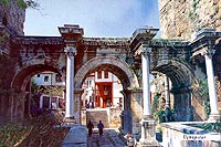 Hadrian's Gate : The only city gate to have survived until the present day is the most attractive of the Pamphylia: Uckapilar (Three Gates), also known as Hadrian's Gate, which is guarded by one tower on either side. Built to honour the emperor Hadrian's visit to the city in 130 AD, the whole gate, except for the columns, is made of pure white marble. The reliefs and carvings are extraordinary.